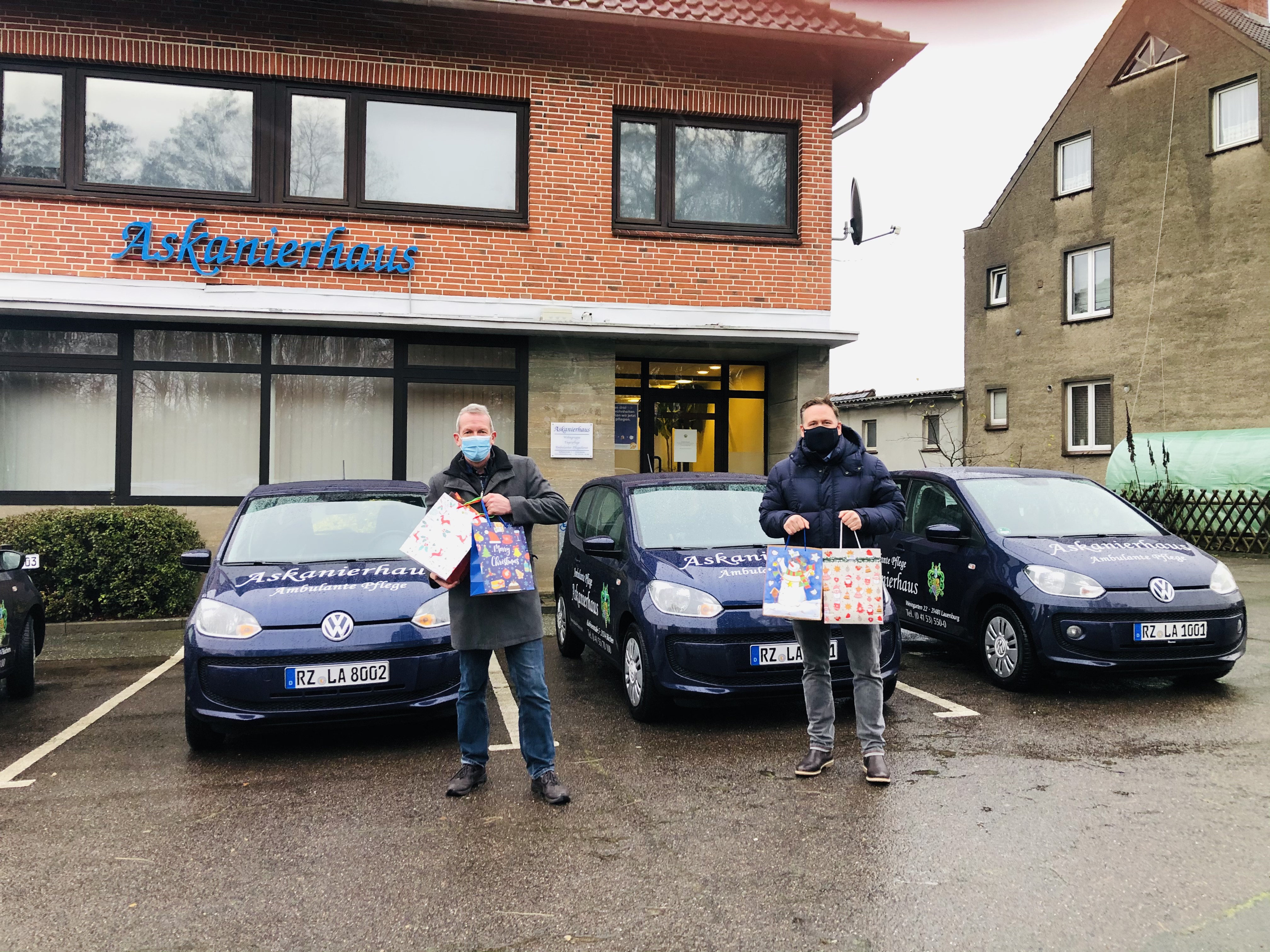 Die Diakonie-Sozialstation, die ASK-Büchen, die Senioren-Pension, das Alte Pastorat und das Askanierhaus standen auf dem „kontaktlosen“ Programm. Kleine Geschenke werden hierbei verteilt.