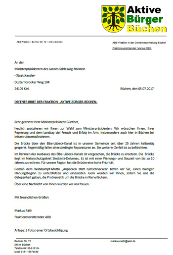 Die ABB-Fraktion hat am heutigen Tag (05.07.2017) einen offenen Brief an den neuen Ministerpräsidenten Daniel Günther zur Planung des Neubaus der Kanalbrücke zwischen Büchen und Büchen-Dorf versendet. Faktionvorsitzender Markus Räth: "Ich selbst habe mit ca. 15 Ministern des Landes oder Mitgliedern des Bundes-, Land- oder Kreistages dort in den vergangenen 25 Jahren gestanden. Deshalb bleibt die ABB nicht untätig, sondern wir versuchen aktiv einen neuen Versuch."